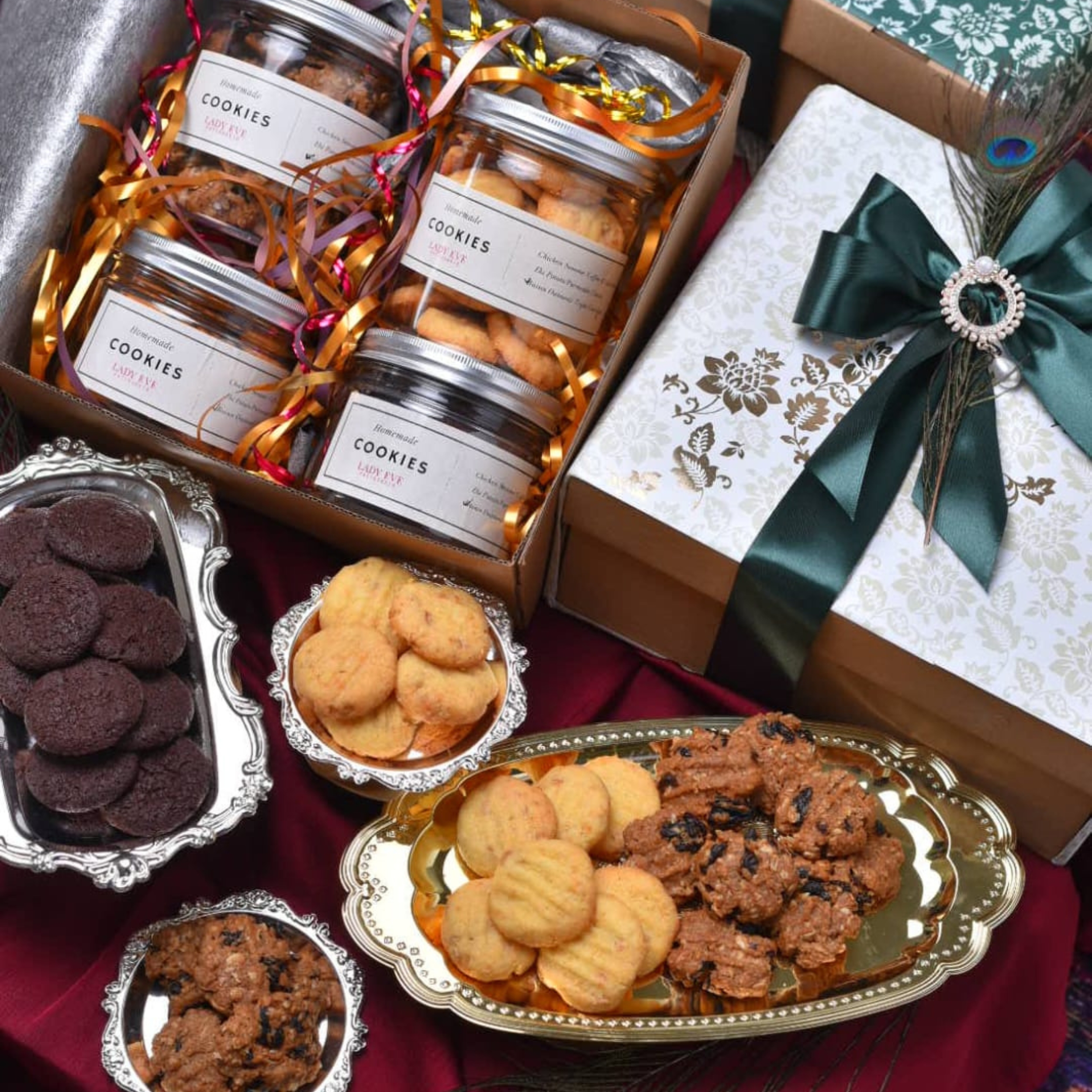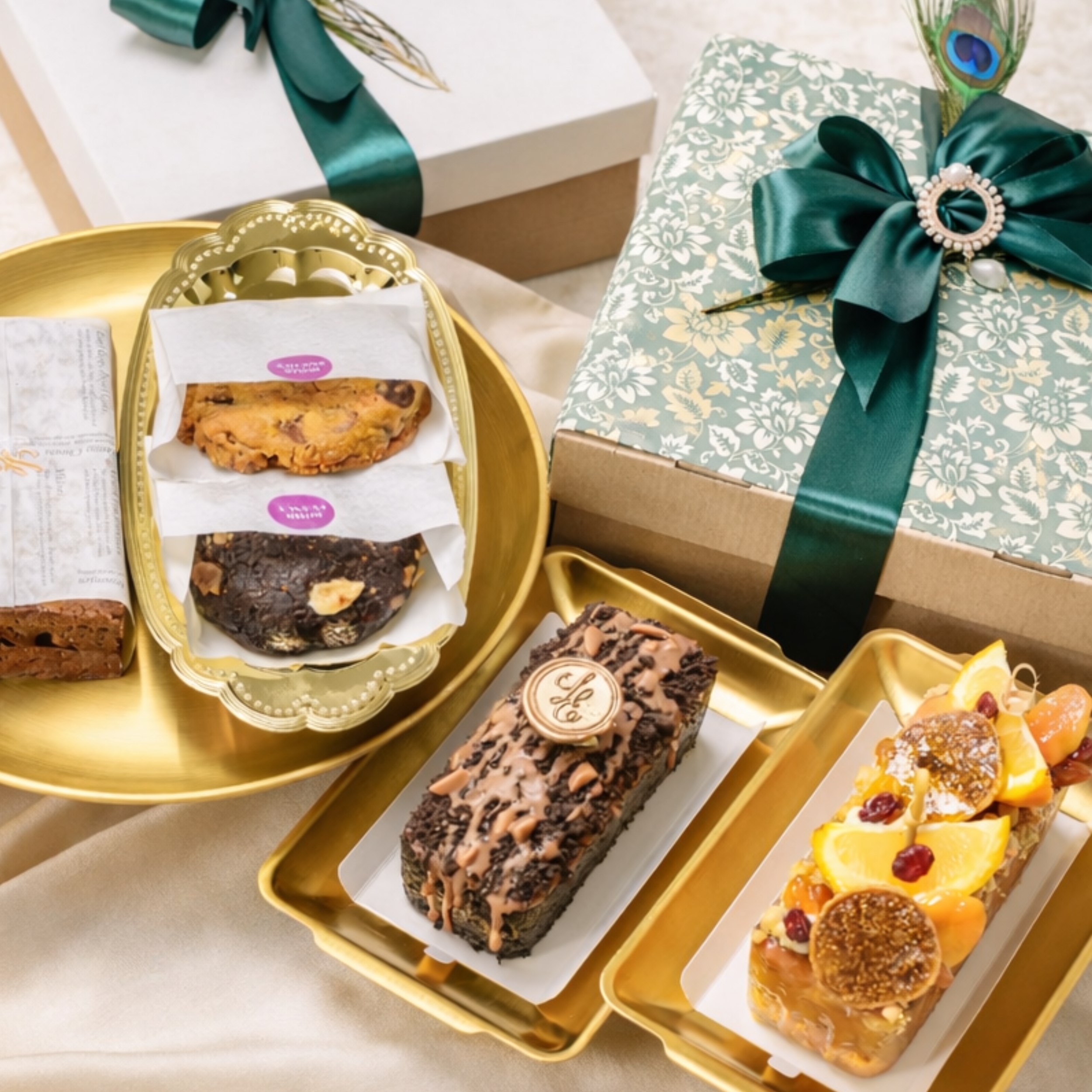 A distinguished collection of cookies, travel cakes, and handcrafted brownies, thoughtfully curated and elegantly presented for the season of Eid.